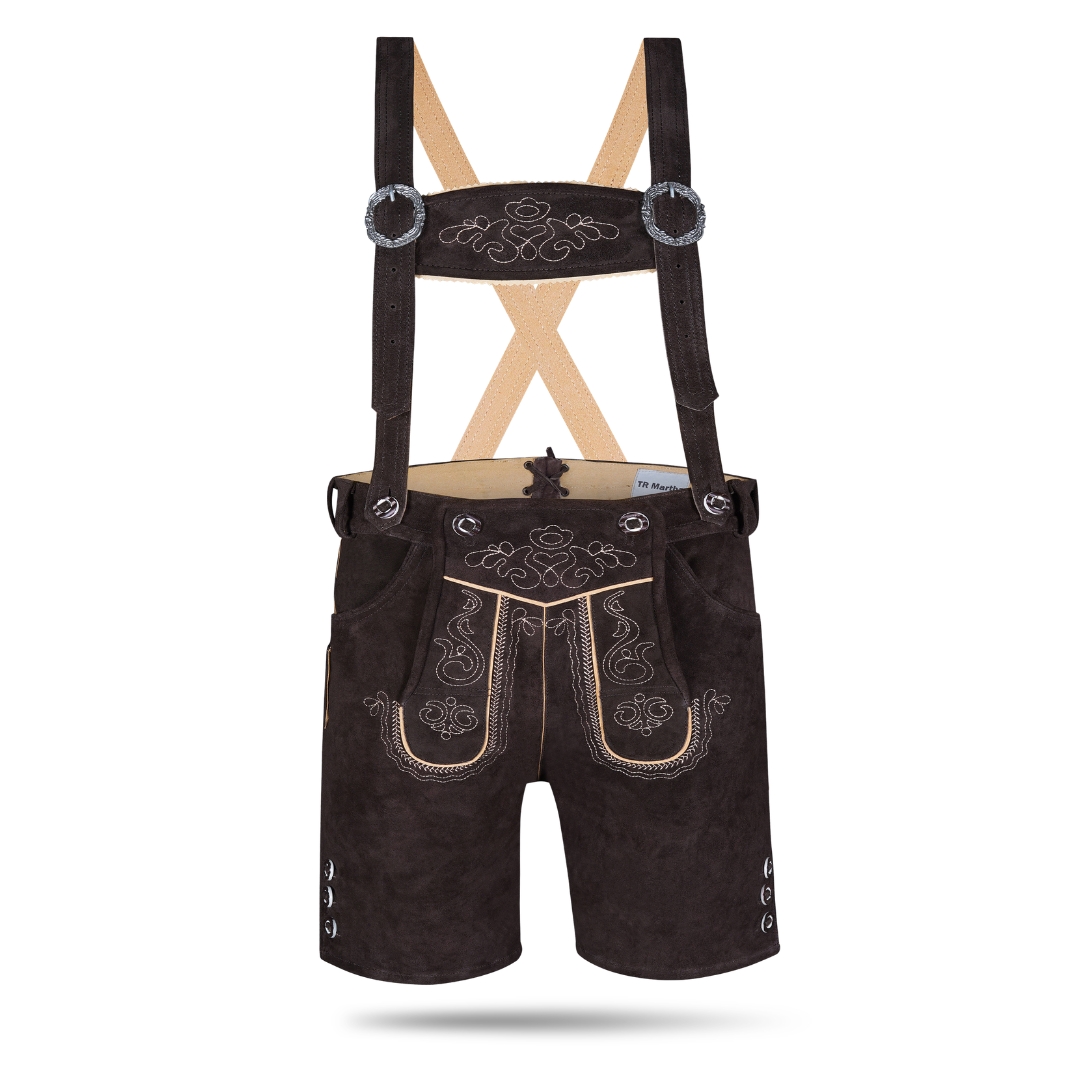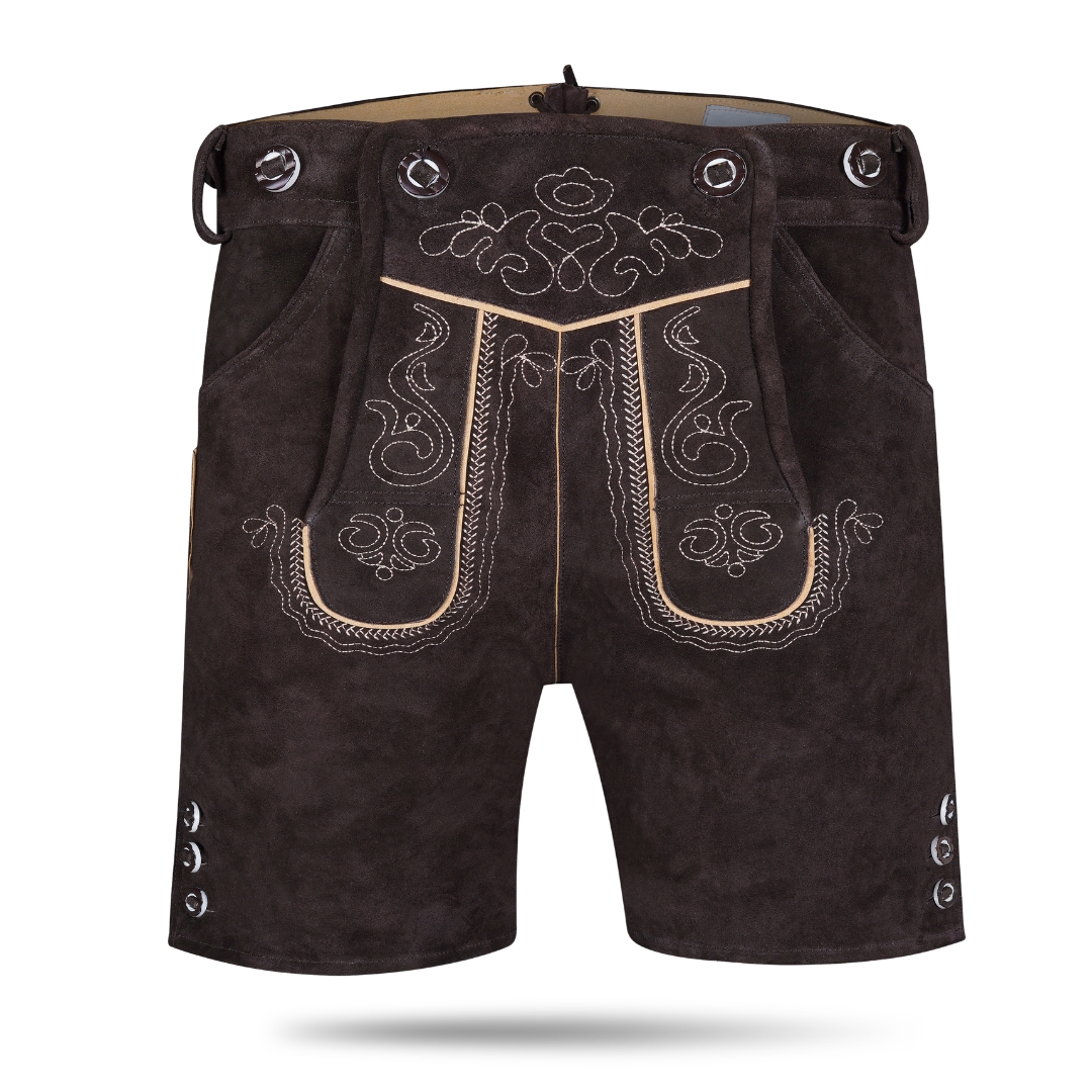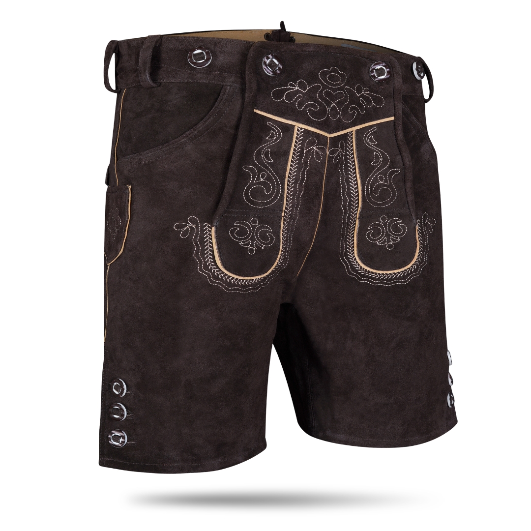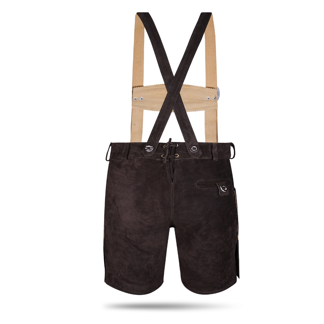 Diese exklusive kurze Lederhose in elegantem Dunkelbraun ist der Inbegriff bayerischer Handwerkskunst.