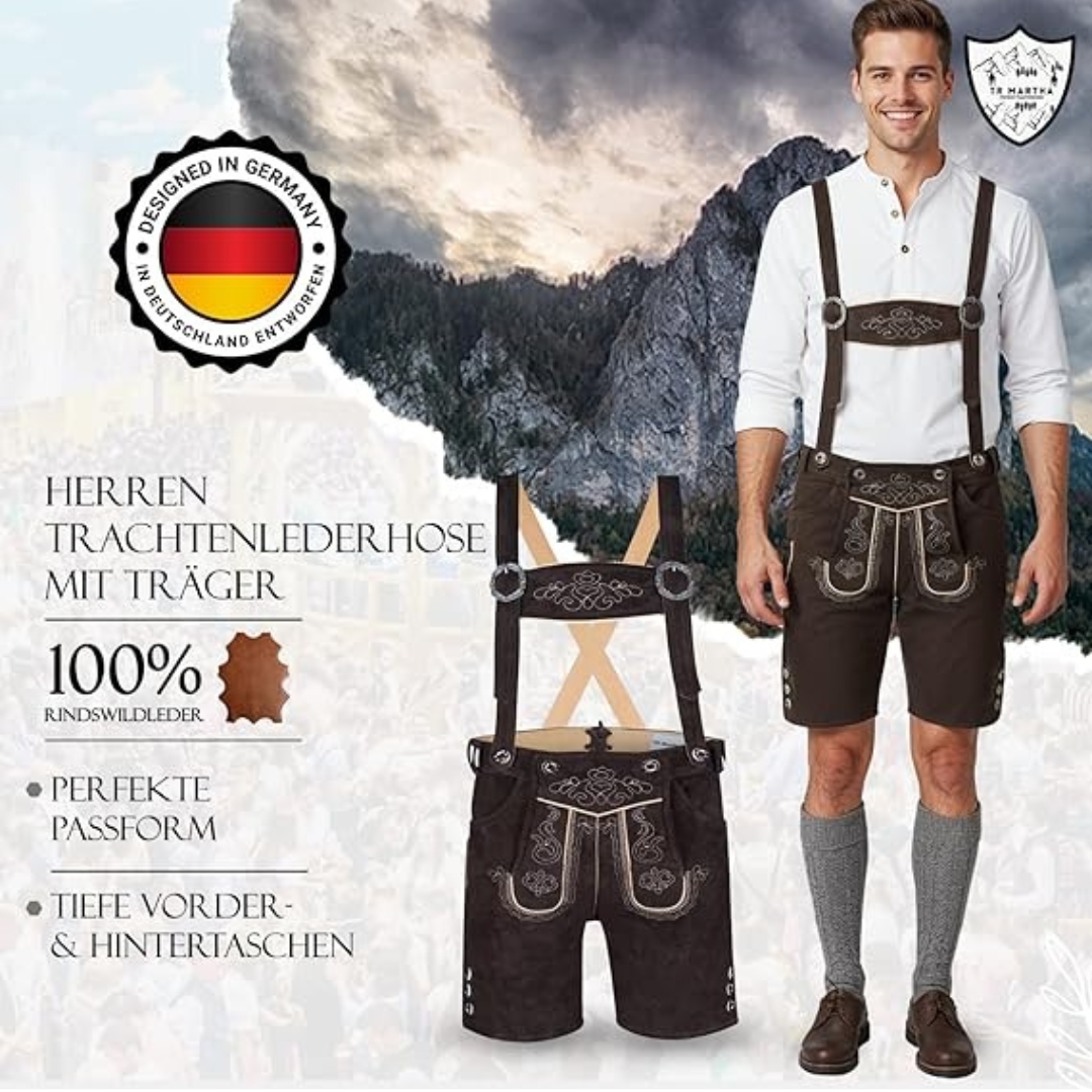 Herren Trachtenlederhose Kurz in Dunkelbraun (Gr. 46-60) – Traditionelle Lederhose mit Trägern – 100% Rindsleder – Echte Trachtenlederhose – Perfekt für Ihr Oktoberfest Outfit