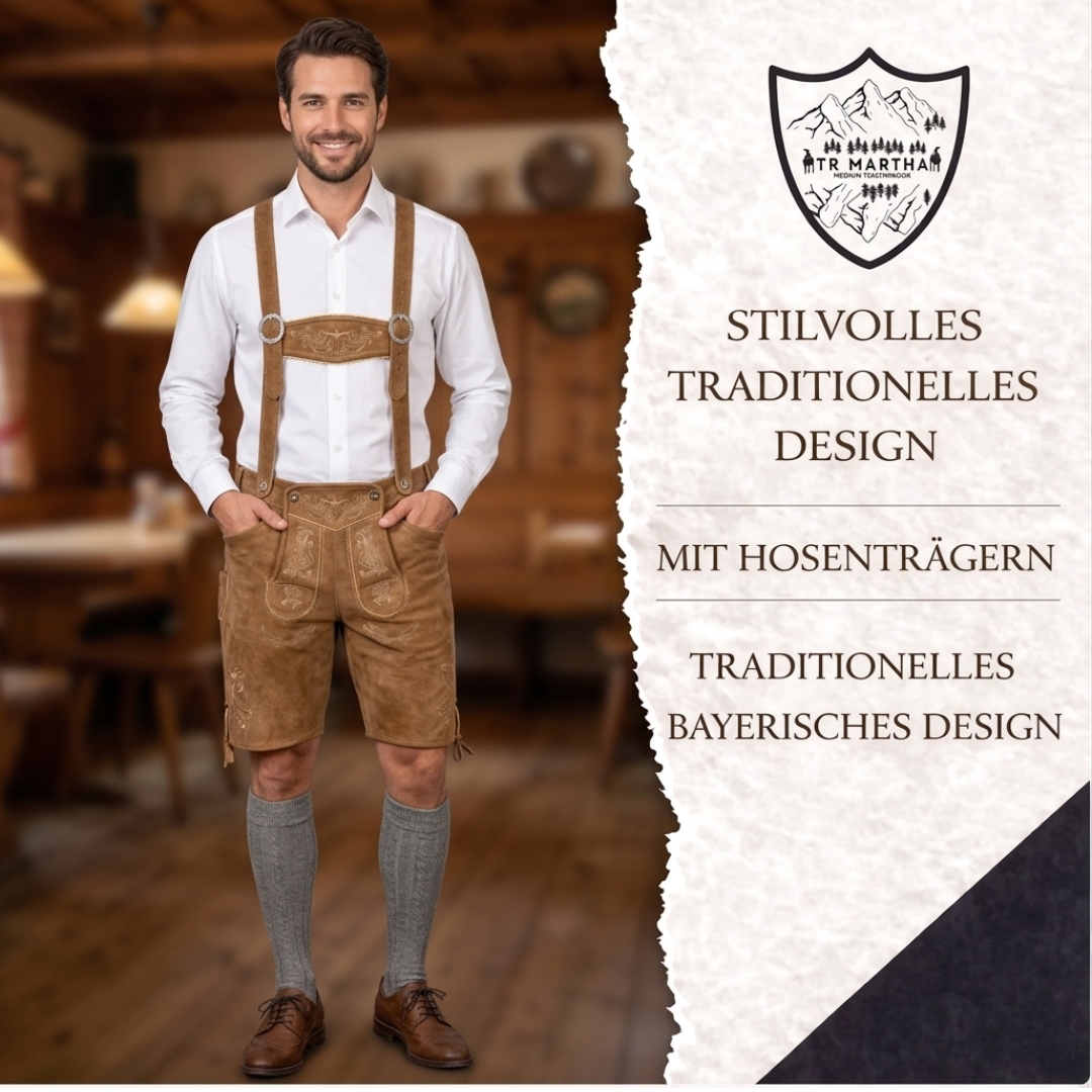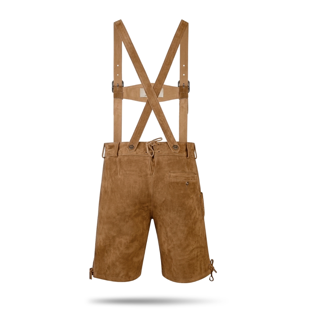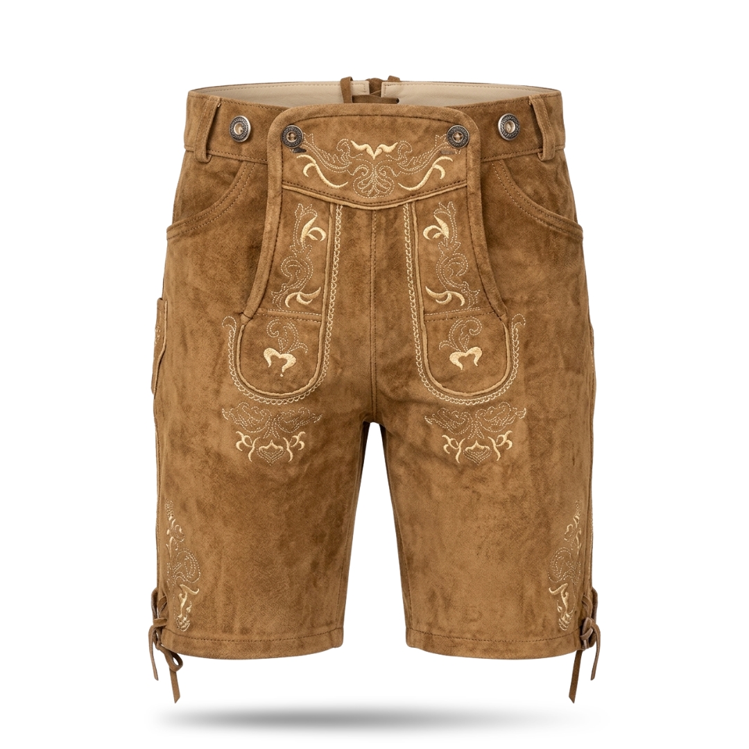 Diese kurze Lederhose aus weichem, hellem Wildleder ist die perfekte Wahl für einen authentischen Trachten-Look.